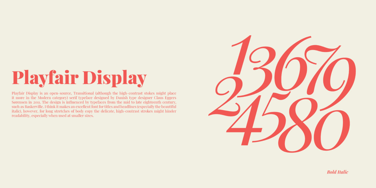 A type specimen is a booklet that demonstrates the range of a typeface, applied too headlines and text in a variety of sizes. Each variation of the typeface should be labeled on the page. Type specimens have existed for centuries to help designers pick a font for a project. Type specimens today can be wildly flamboyant or classical in their approach. Playfair Display is a modern and bold typeface. The mood of the layout is modern, bold, elegant, classy and stylish.